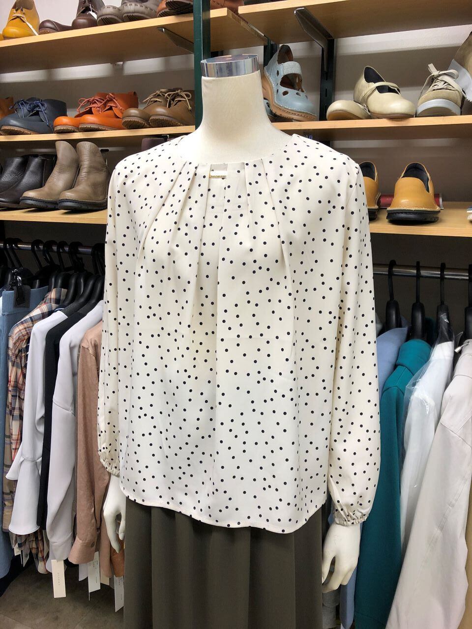 ■PAPILLON SELECT【パピヨンセレクト】★人気の水玉柄^。^/!ランダムドットブラウス!パピヨンセレクトメーカーから、柔らかで肌触りバツグンのポリエステルデッシン生地を使った人気の水玉柄ブラウスが出ました^。^/!やさしいオフ色で、生地の表面がキレイなデッシンはシワにならなくて一年を通して着まわせるのが大人女性には嬉しい!!!袖先はゴム入りのソフトパフ袖なので好みの丈に上げる事ができ、暖かくなると七分袖使いもOK^0^/スーツINにも使えるので一着持っていれば重宝するおススメなブラウスです^0^/