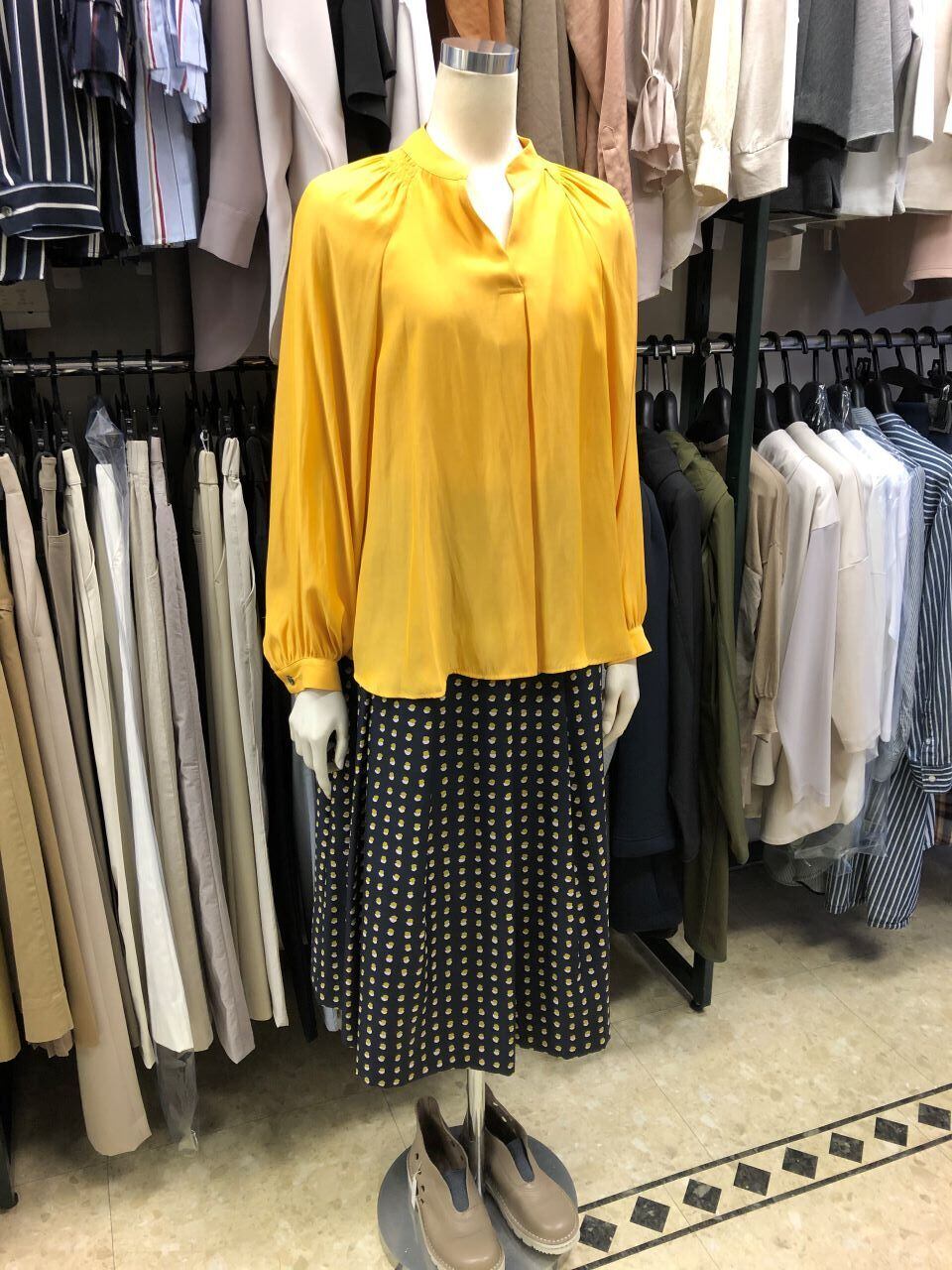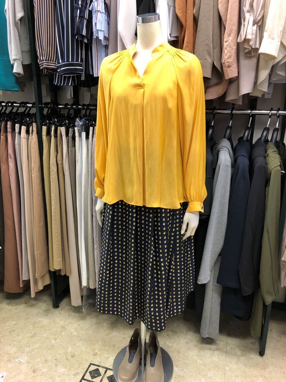 ■C`est moijeu 【セモアージュ】 ★キーネック下のタックと背中ギャザーからの分量タップリなふんわりラインが大人可愛い^。^/!割繊(かっせん)デッシンキーネックブラウス!おススメです!セモアのセモアージュから、人気のキーネック衿ブラウスが出ました^0^/一見シャープ見えするキーネックも、肩から背中へのギャザーでやさしい見えするのは大人ブランドのセモアージュの特徴^0^v首元のスッキリ見えするキーネック部分下のタックからと肩から背中部分のギャザーで裾への分量タップリなふんわりラインは、止まっているときは広がらず、風とか歩いた時の裾の動きがゆらゆらといい感じ^0^/春らしいイエロー色の色使いと可愛さでどんなボトムにも合わせやすくこれからのシーズンにはマストなアイテムです。生地感は、薄手で柔らかな素材で、さらりとした肌触りです。春からのお出かけにはピッタリ~^0^vポリエステル割繊(かっせん)はシワになりにくく、柔らかい風合いと、染色時には深みのある発色性が生み出されます。控えめで上品な光沢感と肌に吸い付く様な風合いが特徴です^^^^!