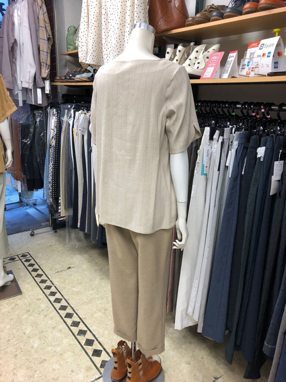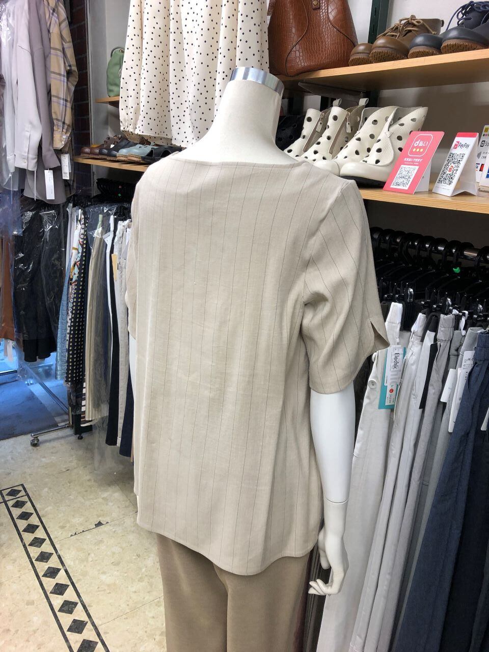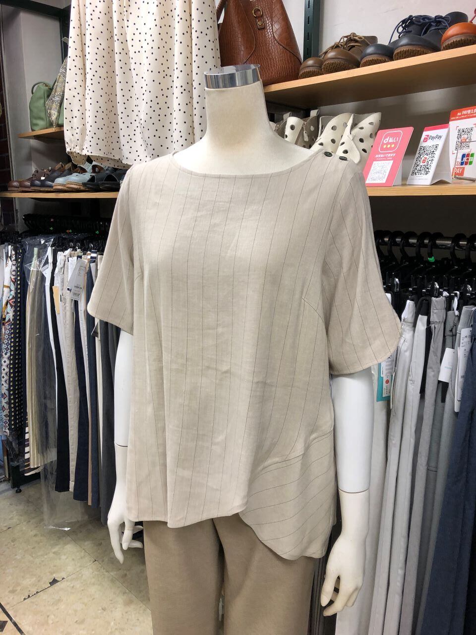 ■C`est moijeu 【セモアージュ】 ★スッキリストライプ柄の麻混ブラウス^。^/!肩ボタンミラクルストレッチストライプブラウス!セモアージュから大人女性に嬉しいキレイな形の夏に快適な麻混生地を使ったデザイン物ブラウスが出ました^0^/暑い夏場に一枚着にした時に見栄える左肩ボタン、腕が細見えする袖先のラウンドカット、ウエスト・ヒップをカバーする左脇裾のアシメトリーなバイアス切り替え等デザイン性もバッチリ^0^/ヘリンボーン織の生地は着心地が良く高見えし、高級感もバツグン!!!バスト下からのゆったりなシルエットのヒップが隠れる後ろ下がり丈は、夏の一枚着にピッタリ^。^/!やっぱりセモアージュは大人のオシャレ!おススメです^。^/!きれいめ大人カジュアルにはピッタリ~^0^/