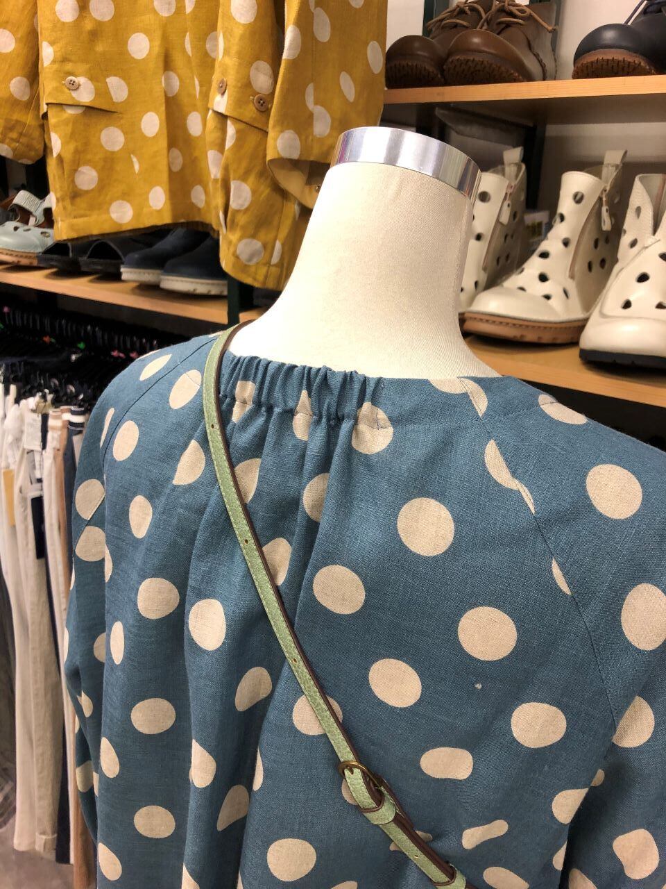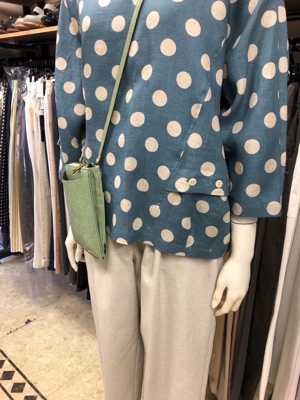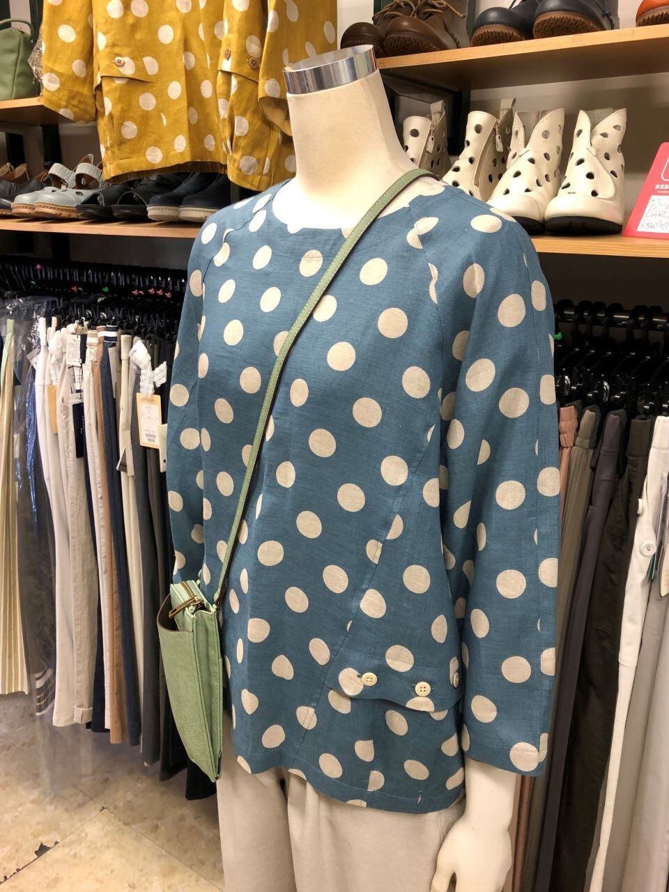 ■PAPILLON SELECT【パピヨンセレクト】★人気の7分丈コクーン袖ブラウス^。^/!ドット(水玉)柄麻ゆるめブラウス!日本製!パピヨンセレクトメーカーから、少し大きめなドット(水玉)柄が大人可愛い麻ブラウスが出ました!ゆるめデザイン(サイズ)だけど、後ろ裾のゴム入りギャザーと両サイドポケットでコクーン風に程よい絞りが利いていて収まり良いのが大人女性には嬉しい!!!7分丈の袖先は大人可愛いソフトコクーン袖^0^/これからの季節には、一着持っていれば重宝するおススメなブラウスです^0^/
