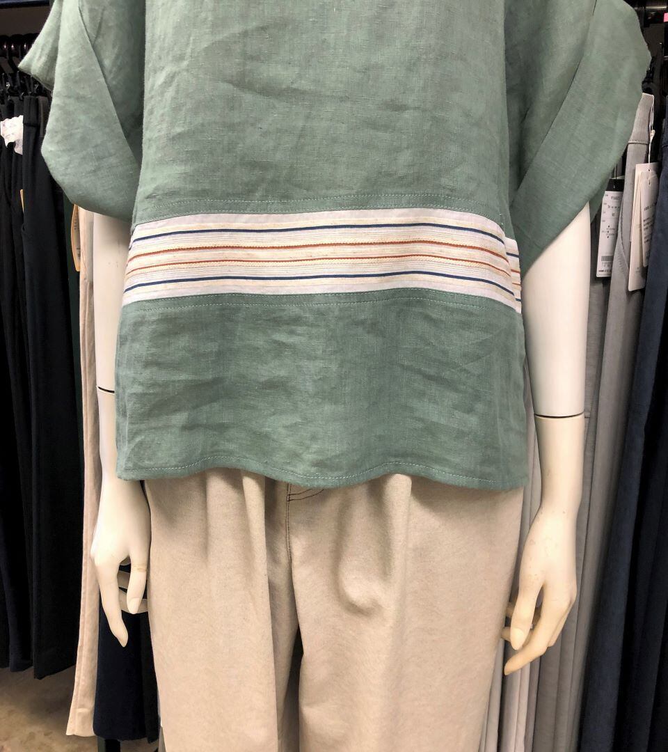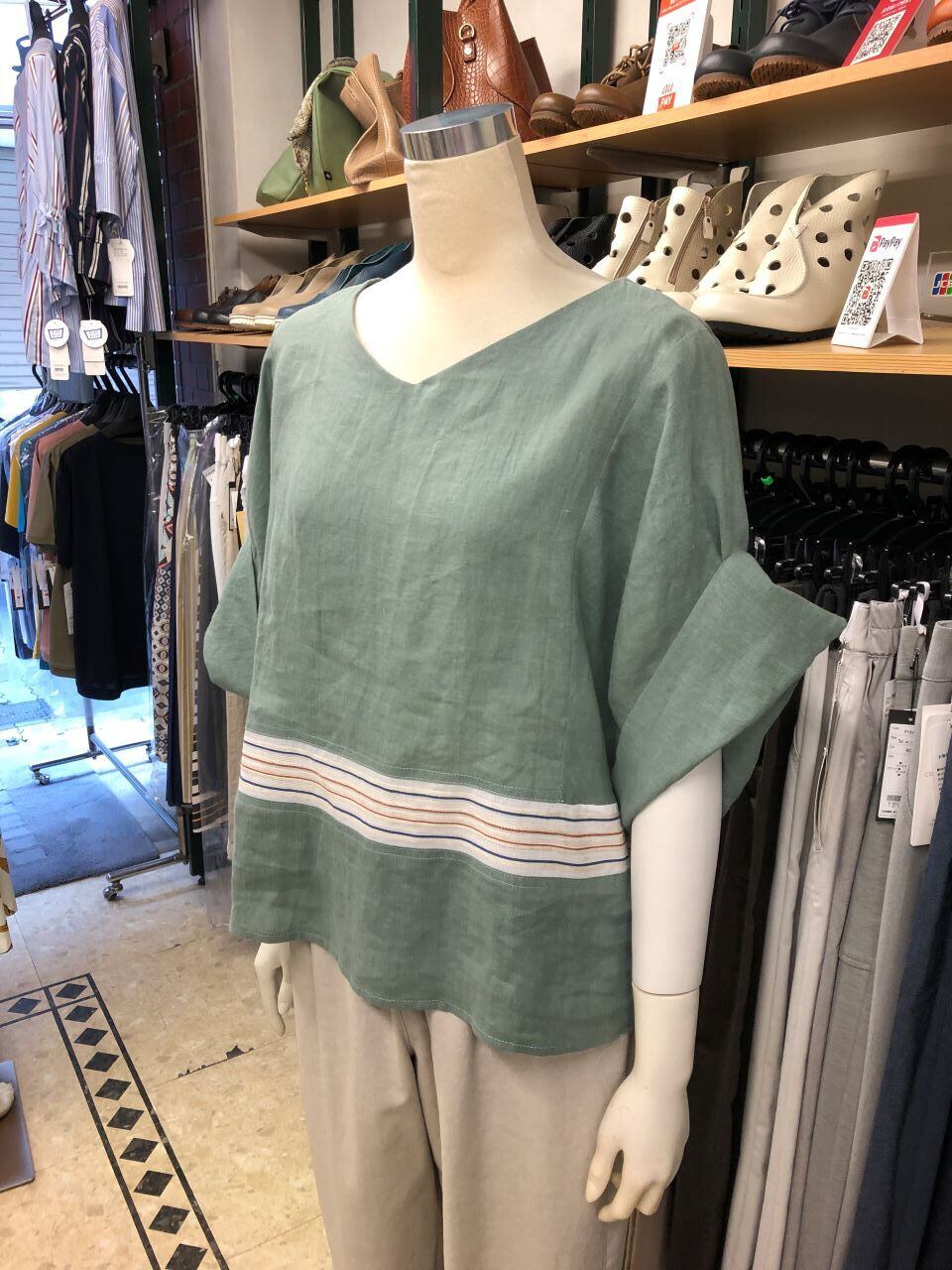 ■C`est moijeu 【セモアージュ】 ★浅V首とウエスト切換でスッキリ見え^。^/!ヴィンテージリネン浅Vネックゆるめブラウス!セモアージュから大人女性に嬉しいゆったりめだけどスッキリ見えする夏に快適な麻生地を使ったデザイン物ブラウスが出ました^0^/暑い夏場に一枚着にした時に首と腕が細見えする少し横開きな浅めVネック&二の腕が隠れる五分丈のダブルカフス袖と、ウエストをカバーする異素材のボーダー切り替え等デザイン性もバッチリ^0^/洗いざらしの風合いの良いヴィンテージリネン生地は柔らかくて着心地が良く高見えし、高級感もバツグン!!!夏の一枚着にピッタリ^。^/!やっぱりセモアージュは大人のオシャレ!おススメです^。^/!きれいめ大人カジュアルにはピッタリ~^0^/