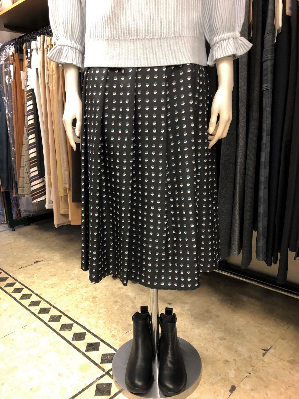 ■C`est moijeu 【セモアージュ】 ★オールシーズン着まわせシワにもならなくて手洗いOKなのが嬉しい^。^/!ビーンズドット柄ソフトプリーツスカート!!!セモアージュの長時間座ってもシワを気にせずオシャレが楽しめるスカートです^0^/ウエストタックから、裾への広がったソフトプリーツラインが上品で大人可愛いプリントスカート^。^/!トップスには、季節によってニット・Tシャツ・ブラウス・ジャケット等々の何とでも相性バツグンなので仕事・お出掛けにもバッチリ!やっぱりセモアージュは大人のオシャレ!おススメです^。^/!きれいめ大人カジュアルにはピッタリ~^0^/
