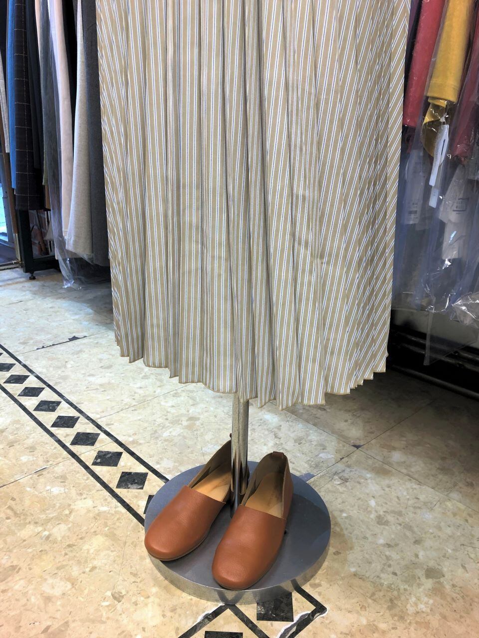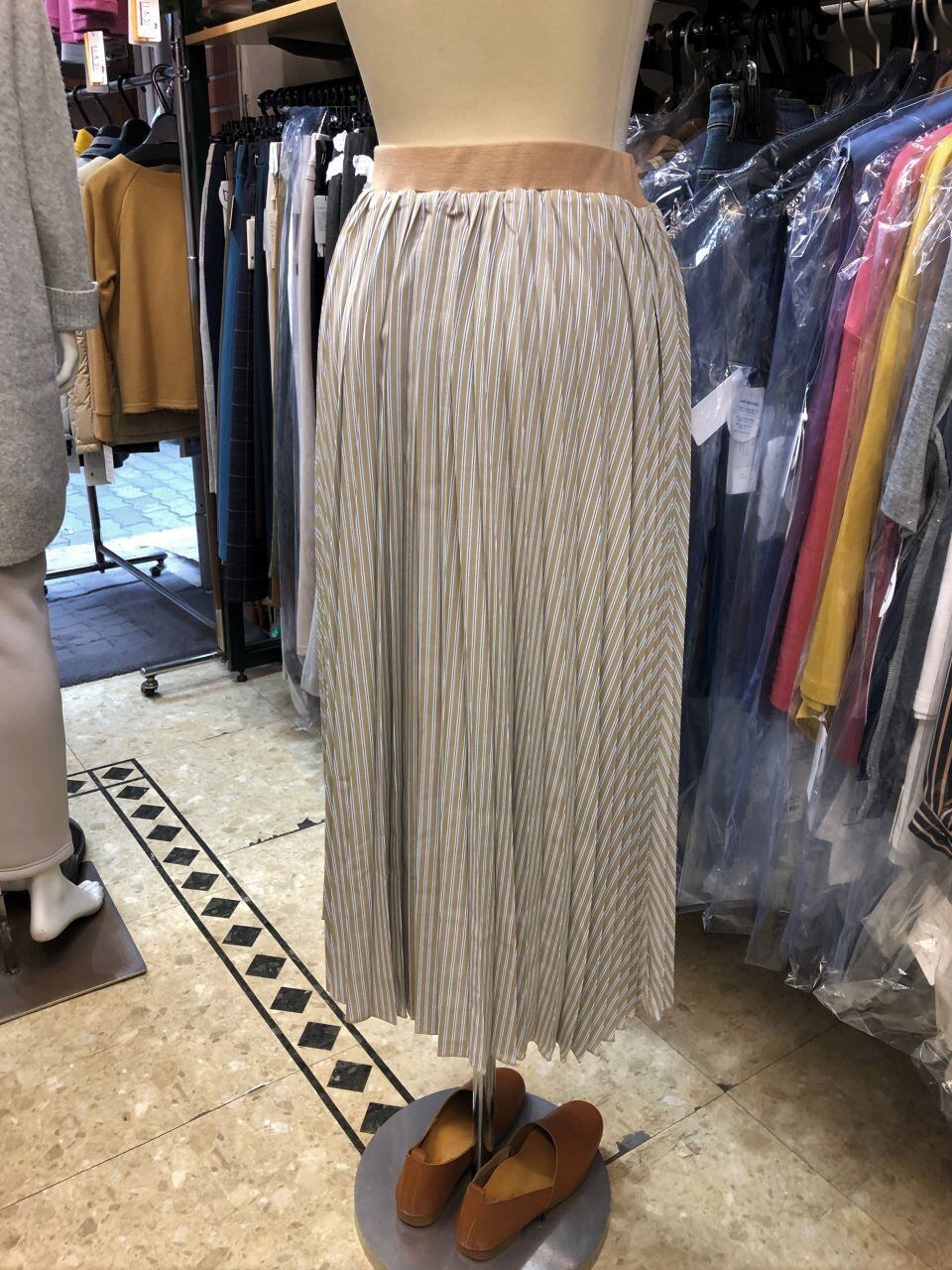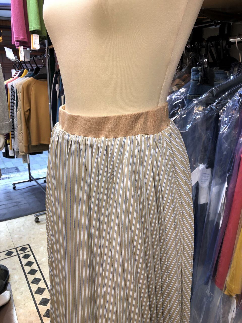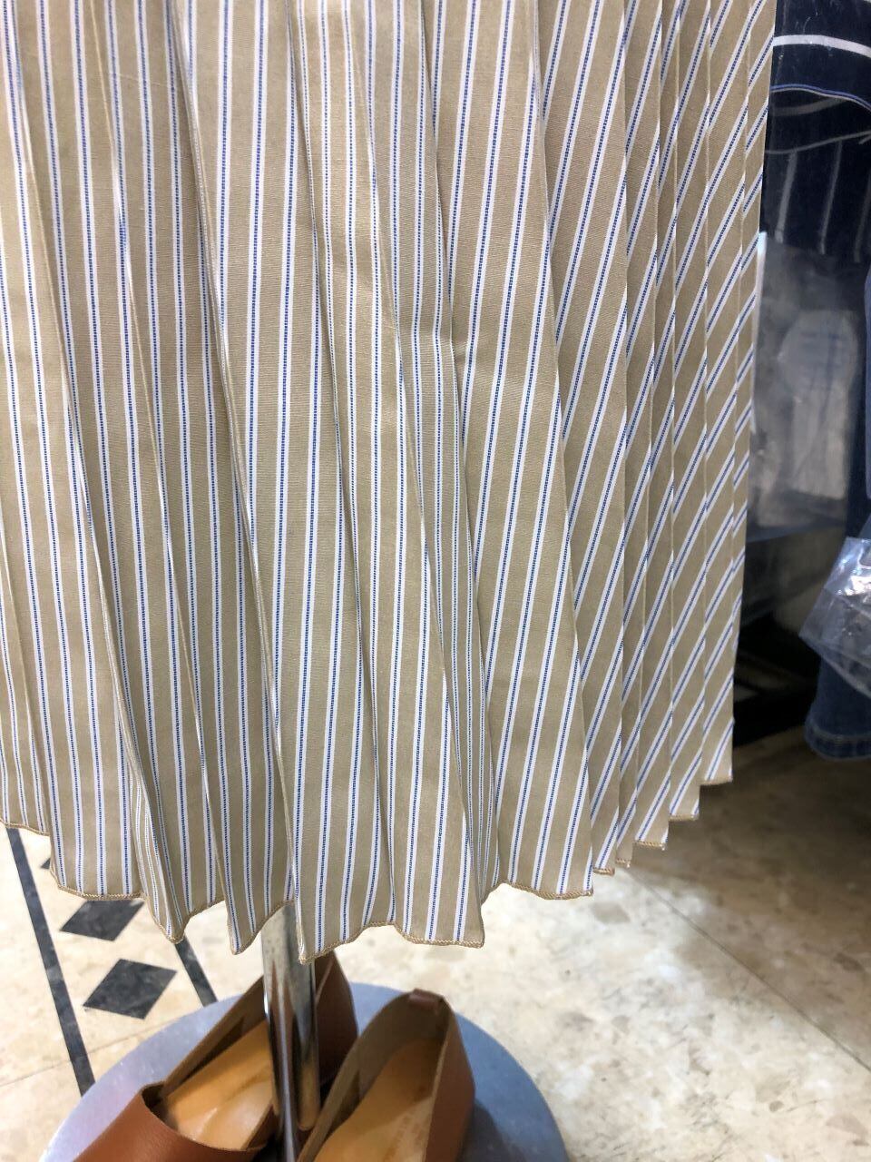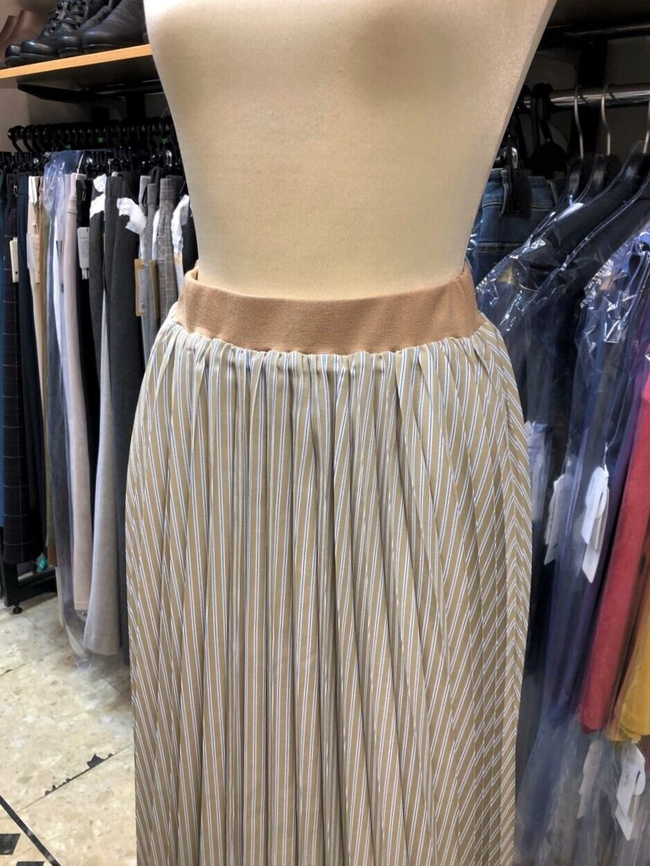 ■ATELIER SIX 【アトリエシックス】 ★動きと風に揺れる均一で細かいひだが上品な、アコーディオンプリーツ^。^/!アコーディオンプリーツスカート!おススメです!春から夏にピッタリな大人の雰囲気漂うストライプ×アコーディオンプリーツのミモレ丈スカートが出ました^0^v細やかなプリーツ加工を施して、立っているとスッキリ見えし、風や動きでプリーツの広がりが綺麗に見える表情豊かなスカートシルエットに仕上げたプリーツスカート!!!春らしくエレガントな女性らしい印象で女子度UP^0^ニットを合わせればカジュアルに、ブラウスを合わせれば上品にと着まわせ、春夏には嬉しいサラサラの裏地付きで手洗い出来る優れモノ^0^/ウエストはしっかりとした織りゴムを使っているので丈夫で安心感もあり、締め付けが無いのでストレスフリーな快適な穿き心地なのも魅力です^0^v