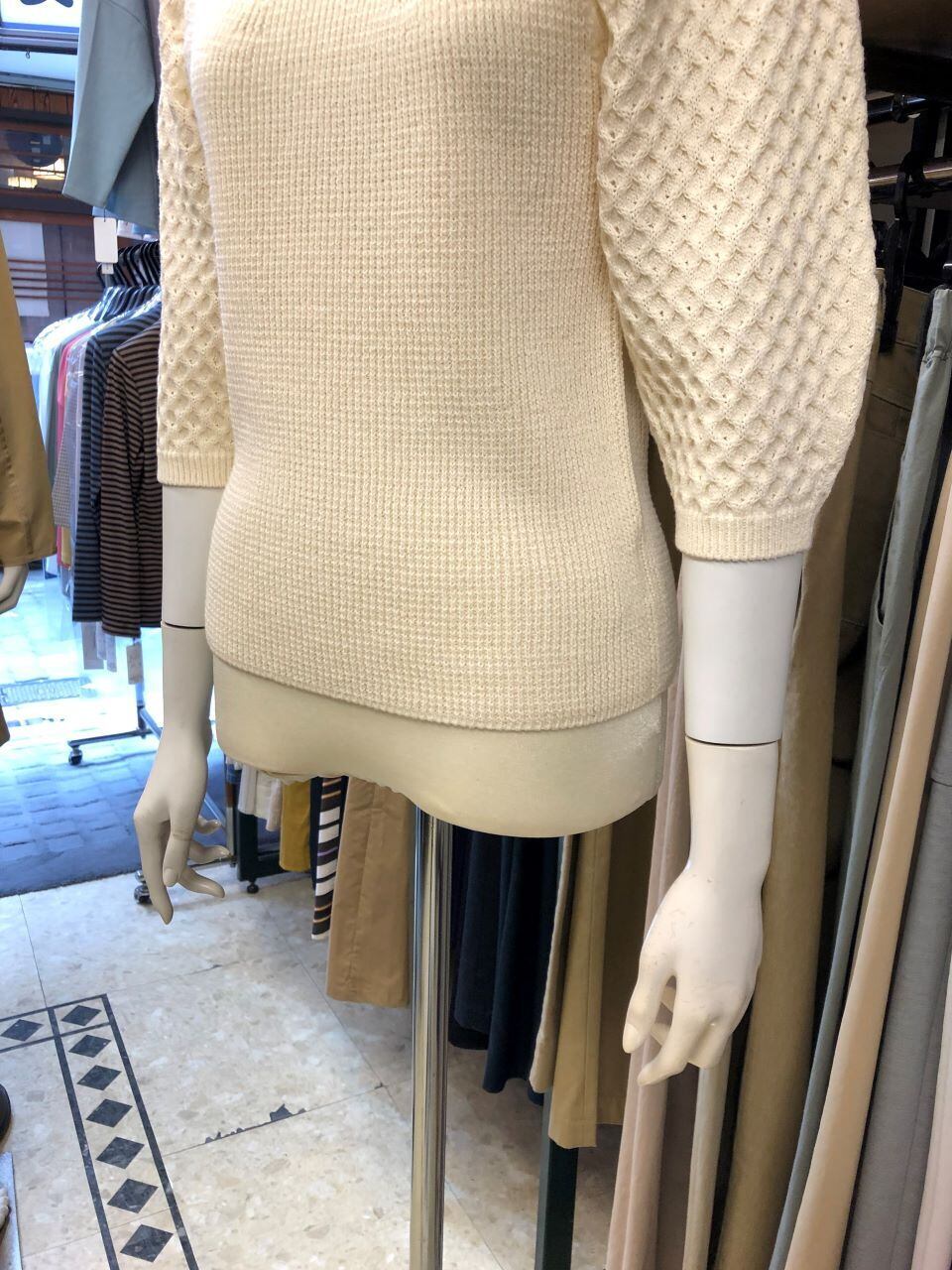 ■PAPILLON SELECT 【パピヨンセレクト】 ★こんなニットが着たかった^。^/!変則編みプルオーバーニット!日本製!おススメです!有るようで無かった!!!パピヨンセレクトの最高にキュートな六分袖ニット^0^/畔編みの上身頃部分は、肩からバストへ身体の曲線に合わせたヨーク切り替えでキレイに身体に添い、袖は少し膨らませたハニカム柄編み!!!フレアースカートとの相性バツグンで春からのお出掛けが楽しみ~^0^/