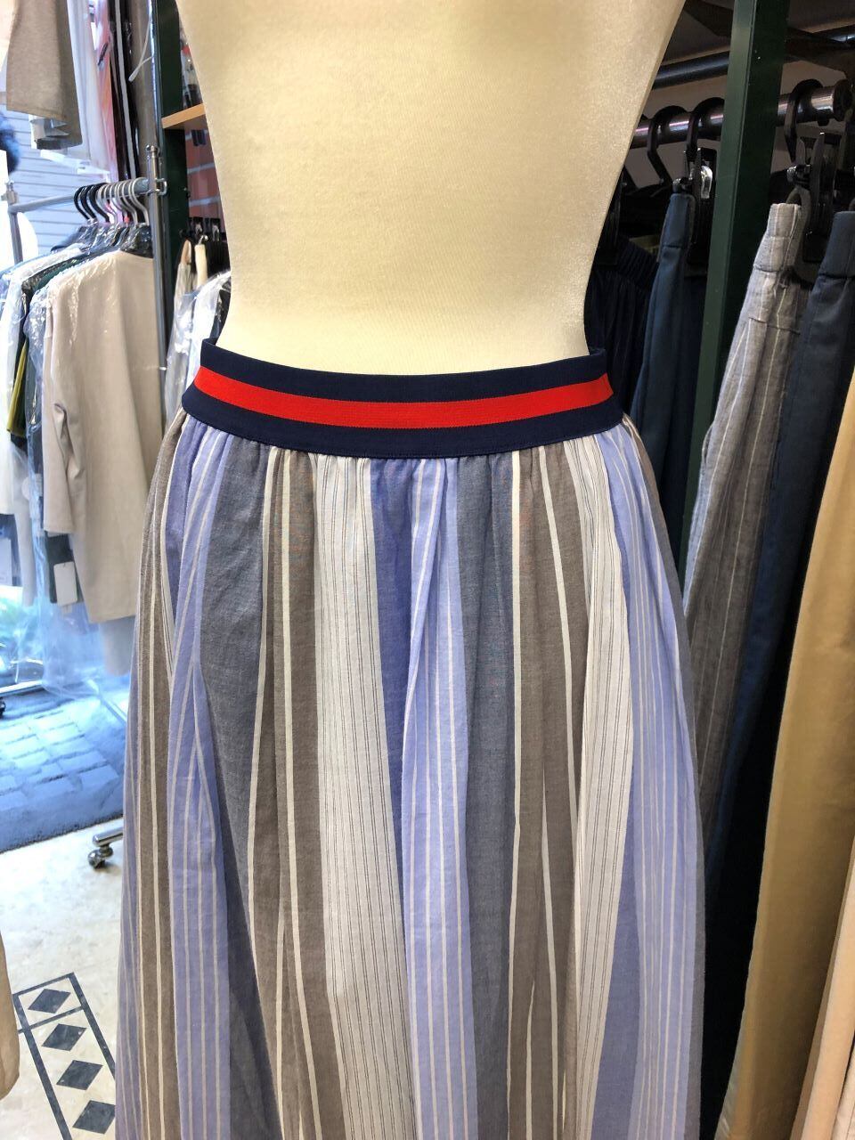 ■PAPILLON SELECT 【パピヨンセレクト】★色や太さ、間隔がまちまちなストライプ柄^。^/!マルチストライプウエストゴムギャザースカート!超おススメです!パピヨンセレクトメーカーの存在感バツグンな綿100%生地を使ったマルチストライプ柄が最高に大人可愛いギャザースカートです^0^/マルチストライプは、通常の一定の同じカラーと線の太さを使ったストライプとは違い、複数の色や違った線の太さが魅力です。夏らしいキレイ色を何色も使った配色は、Tシャツやスニーカーなどの夏のカジュアルとの相性バツグン!!!夏には嬉しい手洗いOK^0^/ウエストはしっかりとした平ゴムを使っているので丈夫で安心感もあり、締め付けが無いのでストレスフリーな快適な穿き心地なのも魅力です^0^v
