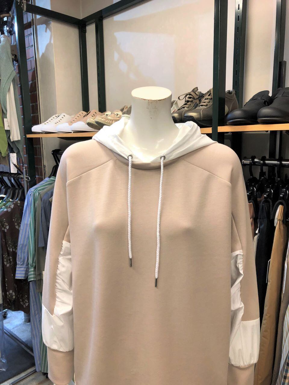 ■ATELIER SIX 【アトリエシックス】 ★重宝する重ね着風プルオーバー^。^/!重ね着風異素材組み合わせパーカー!超おススメです!アトリエシックスから、丸首カットソーの中にパーカーを着ている様な重ね着風プルオーバーが出ました^0^/フードと袖・裾に少し張り感の有るシャツ生地を使い丸首のカットソーと縫い合わせているので着崩れ・コーディネートの心配なく、初夏まで一枚着で楽々にオシャレが楽しめます^0^vカジュアルなデザインだけど、表面がシルキーなキレイ色なので大人女性のきれいめカジュアルにはピッタリ~^0^v春夏物には嬉しい手洗いOK!!!