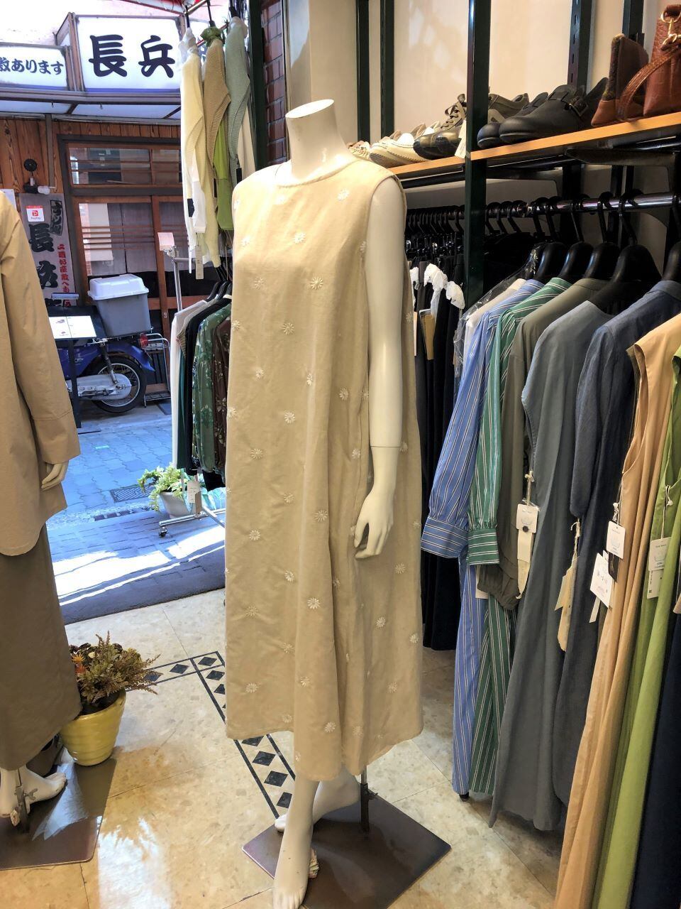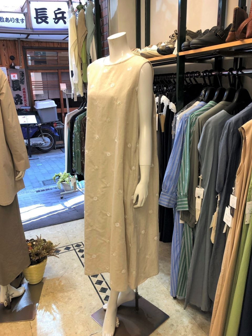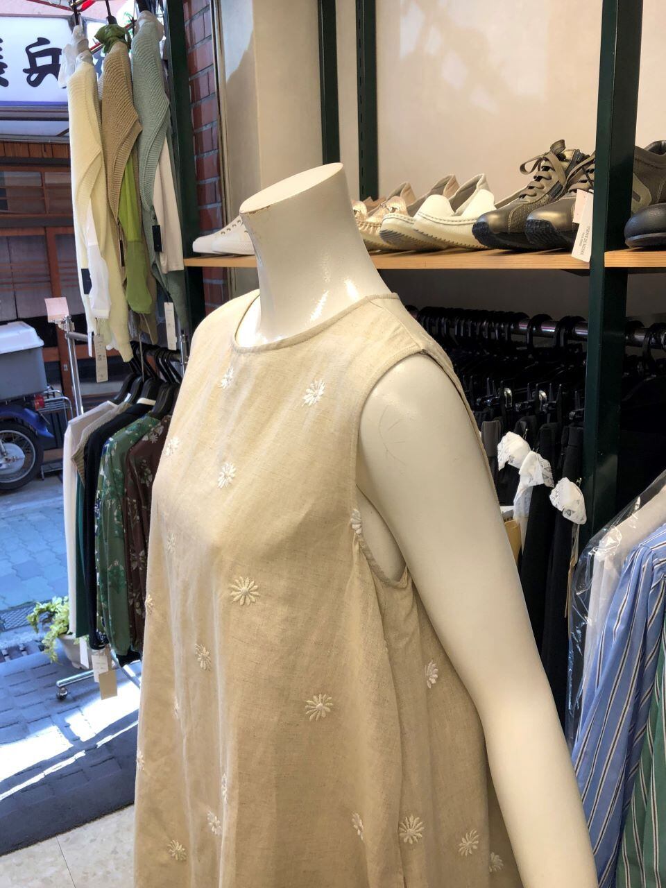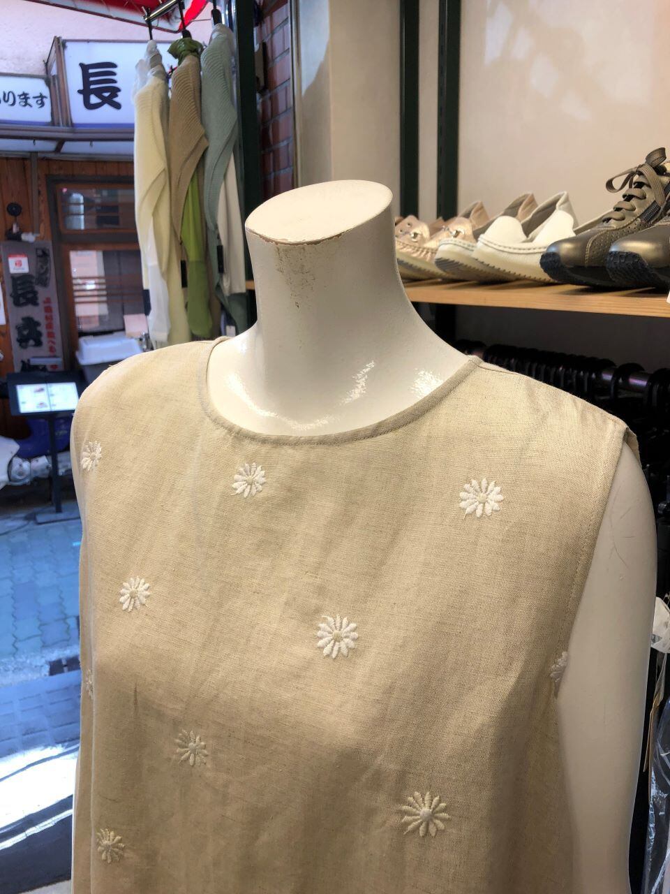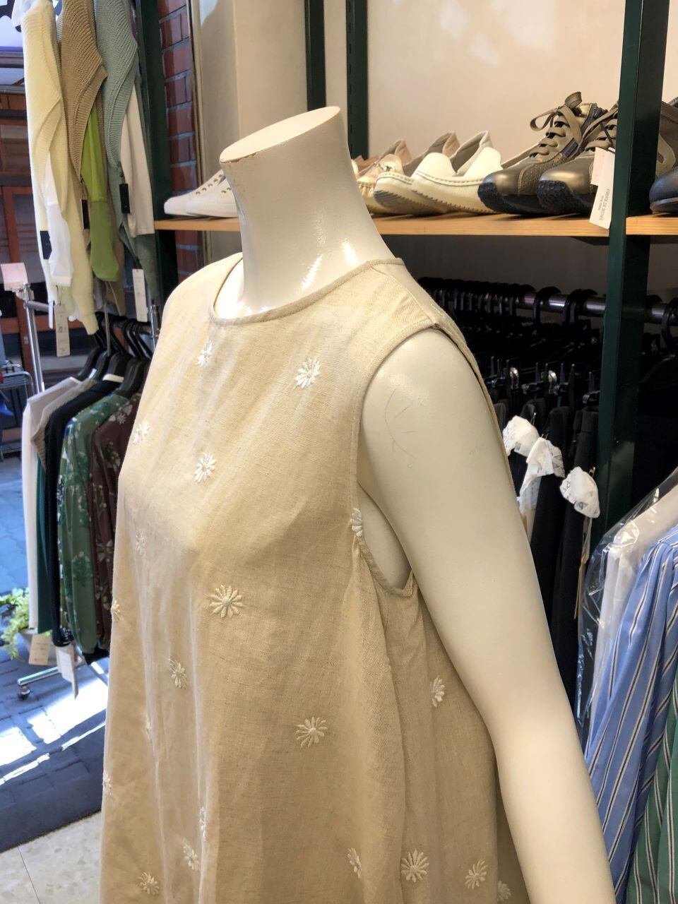 ■ATELIER SIX 【アトリエシックス】★春夏に人気の花刺繍ワンピース^。^/!マーガレット刺繍麻混フレアーロングワンピース!アトリエシックスから、今年も春夏の超定番素材、麻混生地のワンピースが出ました!麻×綿の天然素材を使った生地は、ナチュラルな風合いと自然な小じわが素肌に心地よい肌触りで、通気性が良くこれからの季節にピッタリ^0^vデザインはマーガレット刺繍が大人可愛くて、ワンピースとしての永遠に不滅なフレアーロング丈で、ノースリブだけど少し広めにした肩幅が大人女性には嬉しい^0^/ゆるすぎない程よいゆとりの身幅とフレアーなロング丈が大人女性にはピッタリなワンピース^0^/これからの季節には、一着持っていれば重宝するおススメなワンピースです^0^/