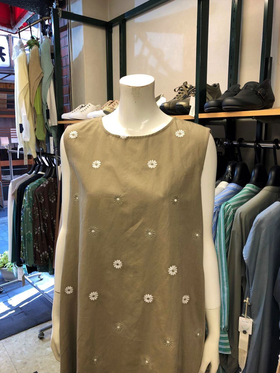 ■ATELIER SIX 【アトリエシックス】★春夏に人気の花刺繍ワンピース^。^/!マーガレット刺繍麻混フレアーロングワンピース!アトリエシックスから、今年も春夏の超定番素材、麻混生地のワンピースが出ました!麻×綿の天然素材を使った生地は、ナチュラルな風合いと自然な小じわが素肌に心地よい肌触りで、通気性が良くこれからの季節にピッタリ^0^vデザインはマーガレット刺繍が大人可愛くて、ワンピースとしての永遠に不滅なフレアーロング丈で、ノースリブだけど少し広めにした肩幅が大人女性には嬉しい^0^/ゆるすぎない程よいゆとりの身幅とフレアーなロング丈が大人女性にはピッタリなワンピース^0^/これからの季節には、一着持っていれば重宝するおススメなワンピースです^0^/