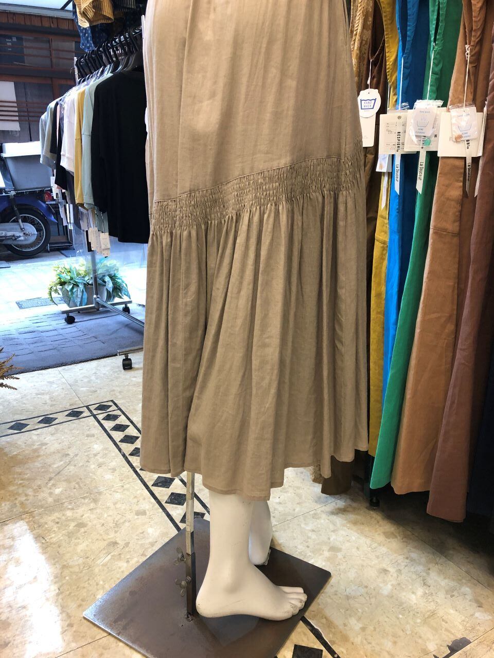 ■PAPILLON SELECT【パピヨンセレクト】★やっぱり大人可愛いティーアードロングスカート^。^/!スパイラルティーアード裾イレギュラースカート!パピヨンセレクトメーカーから、春から秋まで着まわせるティーアードのロングスカートが出ました^。^/!やっぱり大人かわいい~!!!いくつになっても穿きたい段々に切り替えされたティーアードのロングスカート^0^vバネの様にスパイラルに切り替えた手の込んだワークテイストなデザイを取り入れたスカート^0^/女性らしさを引き立てるティアード切り替えを入れることにより、カジュアルな中にもフェミニンさが漂う1着に仕上げました^0^vウエストは楽チンな後ろギャザーゴムになっており、裾は動くたびに立体感のある美しいシルエットが現れて、お出掛け楽しくなる1枚です^0^/