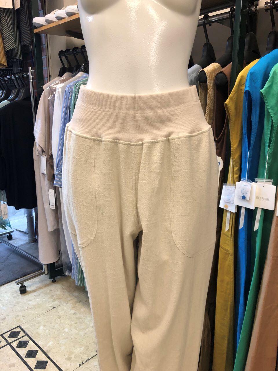 ■PAPILLON SELECT【パピヨンセレクト】★個性派に大人気^。^/!ウエストワイドリブエッグパンツ!パピヨンセレクトメーカーから、個性派にピッタリなころんとした、手洗いOKなたまご型シルエットが大人可愛いパンツが出ました(同素材のベスト有り)。一見無地見えしますが、生地の表面に凹凸があるスラブ生地を使っていて、独特の丸みのあるきれいなラインのシルエットを出しています。ウエストはワイドリブ切り替えの内側にしっかりとした平ゴム入り仕様で、前後にポケットを付けた全体的にゆるっとしていてリラックス感が有るノンストレスパンツです^0^/※スラブ生地とは、糸の長さ・太さ・形が不規則なスラブ糸で編んだ生地のことで、生地の表面に凹凸があり、ナチュラルな素材感が特徴です。 表情豊かなナチュラルな清涼感が感じられるので、これからの春から夏、夏から秋にかけての季節にぴったりな素材です^0^/